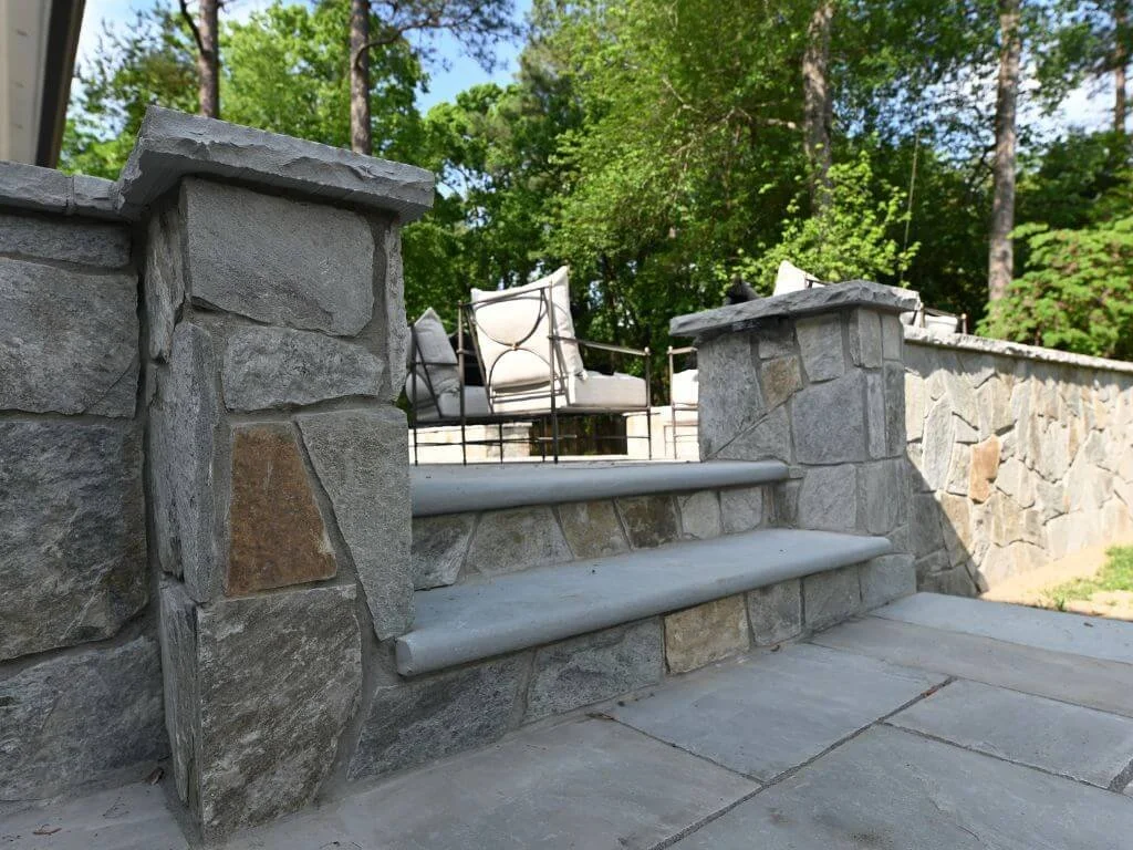 Norwick Rd. elevated patio install with stairs leading to the house from multiple directions. Custom landscaping throughout the yard and around the patio.